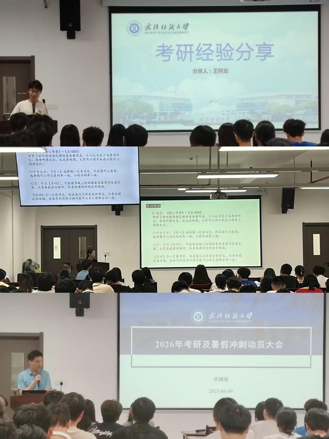 活动还邀请了2022届校友李博惟、2025届毕业生王梓龙、邓心悦分别就考研信息收集、考试科目选择、备考计划制定、备考心态调试等方面来提供了系统指导和给于了合理化的建议。最后,学生也就自己关心的考研问题进行了提问,参会老师和优秀学生代表进行了答疑。与会同学纷纷表示要向优秀学长们学习,坚定考研信心,做好时间规划,安排好复习节奏,坚持到底,一战成硕。