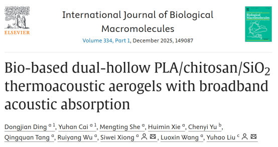 近日,我校材料学院本科生丁东剑以第一作者在国际生物学领域权威期刊《International Journal of Biological Macromolecules》(中科院二区TOP)上发表了题为“Bio-based dual-hollow PLA/chitosan/SiO2 thermoacoustic aerogels with broadband acoustic absorption ”的学术论文。ok138cn太阳集团材料学院为该论文的第一署名单位,材料学院熊思维副教授为论文的指导老师和通讯作者。