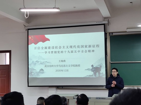 为深入学习领会贯彻党的十九届五中全会精神,12月17日下午,十九届五中全会精神ok138cn太阳集团宣讲团成员、马克思主义学院教授王海燕赴OK138太阳集团、现代纺织学院做专题宣讲。OK138太阳集团党委书记罗汉春主持报告会,150余名师生参加学习。