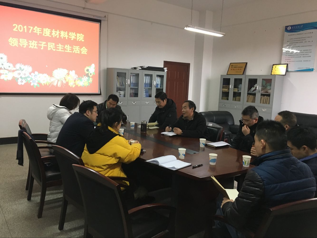 2018年1月22日上午,按照中央和省委要求,材料学院党委领导班子在学院会议室召开了2017年度民主生活会。本次民主生活会的主题是:认真学习领会习近平新时代中国特色社会主义思想,坚定维护以习近平同志为核心的党中央权威和集中统一领导,坚持用党的十九大精神武装头脑、指导实践、推进工作,进一步强化"四个意识",坚定"四个自信",坚守立德树人的根本使命,进行自我检查、党性分析,开展批评和自我批评,研究加强学院领导班子自身建设的措施。