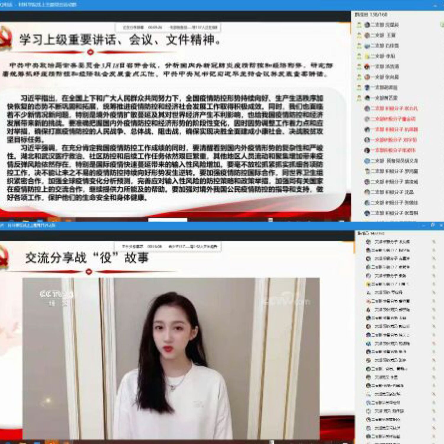 学生支部活动由沈星辰同志主持,活动中,各学生支部按流程线上奏国歌,重温誓词,并集中学习中共中央办公厅印发的《关于持续解决困扰基层的形式主义问题为决胜全面建成小康社会提供坚强作风保证的通知》(以下简称《通知》),接着,学生二支部书记黄鹤老师、学生一支部书记祝捷老师分别带领同志们宣读学习了深入学习贯彻了习近平总书记关于疫情防控和复工复产等的重要讲话和重要指示精神。并引导各学生党员学会认清当前肩负的重要职责和使命,不断增强“四个意识”、坚定“四个自信”,发挥学生党员的模范带头作用,在疫情期间,用各种形式为疫情防控做出力所能及的贡献。