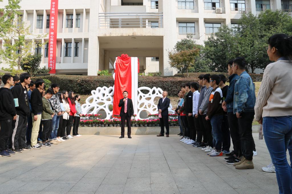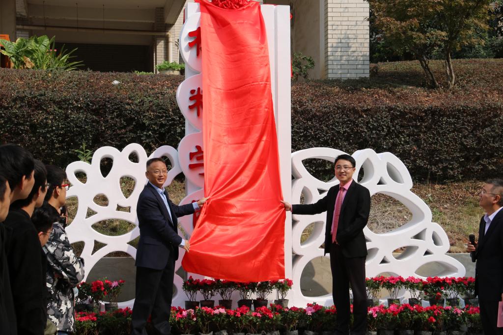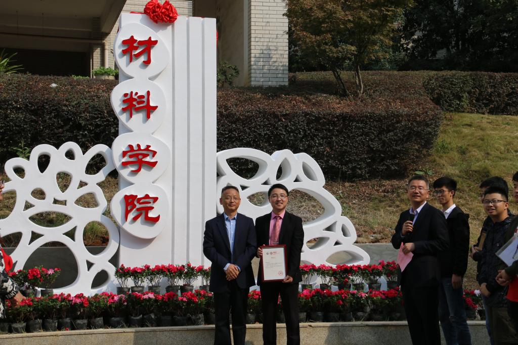 副校长罗锦银,浙江迅实科技有限公司总经理金良共同为材料学院院名揭牌,副校长罗锦银为金总颁发了研究生企业家导师聘书。学院教职工在院名牌前合影留念。