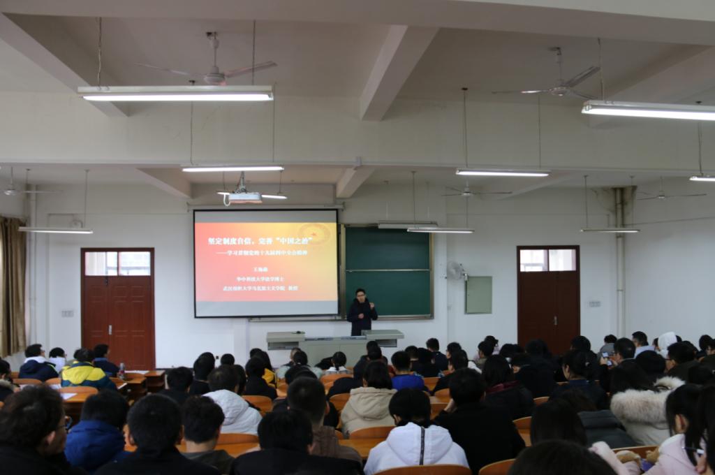 为深入学习领会贯彻党的十九届四中全会精神和习近平新时代中国特色社会主义思想,12月19日下午,十九届四中全会精神ok138cn太阳集团宣讲团成员、马克思主义学院教授王海燕赴OK138太阳集团、现代纺织学院做专题宣讲。OK138太阳集团党委副书记秦梦主持报告会,近两百名师生参加学习。