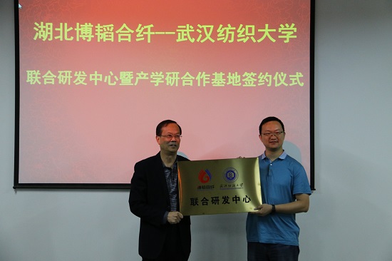 最后,校科技处处长冯军代表学校与博韬合纤签订了合作协议,刘在洲书记为联合研发中心和产学研合作基地授牌。