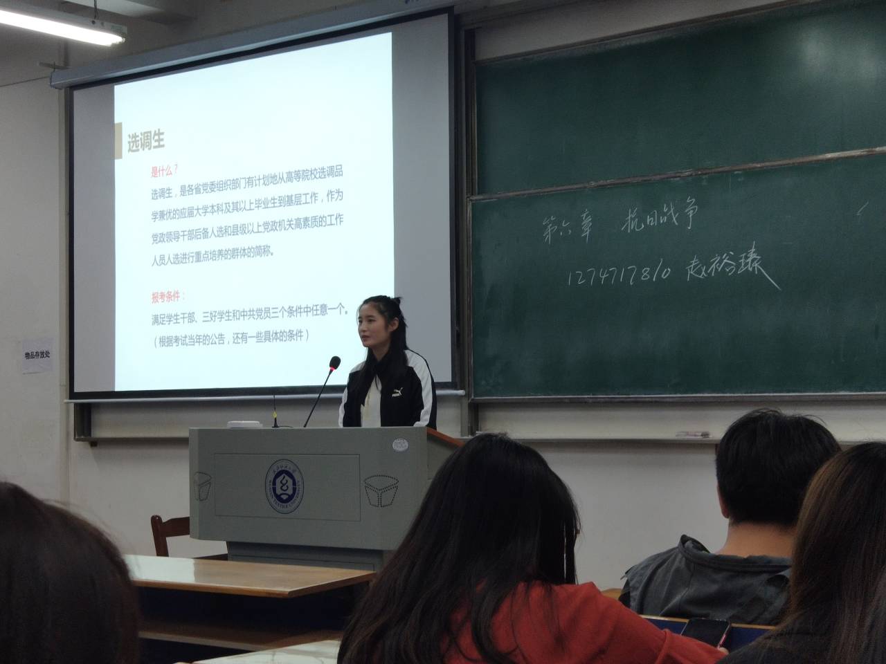 王鑫,2017年通过湖北省选调生考试,2017年至2020年就职于孝感市大悟县。她结合自身经历深情并茂地讲述了基层工作中的心得体会,强调基层磨练的重要性与必要性。之后围绕仰望星空与脚踏实地展开,引导材料学院学生树立正确的三观。并向同学们详细讲解了选调生的报考条件、考试时间、考试科目等内容,估计同学们积极报名。