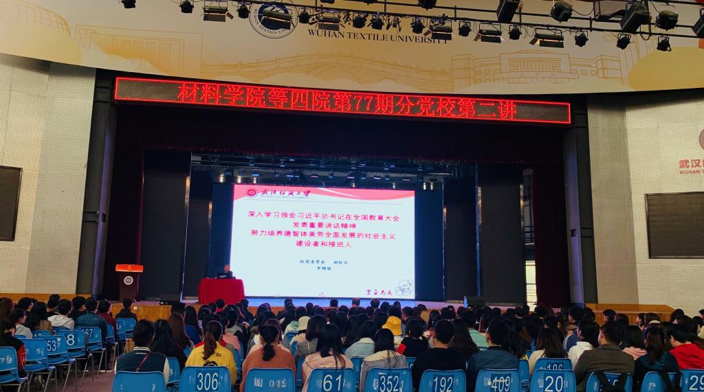 3月28日,纺织学院、机械学院、材料学院、管理学院等四个学院党校联合开办的第77期分党校第二讲在大活演播厅举行。本次党课由校党委常委、副校长罗锦银教授主讲,参加此次党课的有材料学院、机械学院、纺织学院、管理学院全体积极分子,学校机关党委财务处党支部、资产与实验室管理处党支部、离退休工作处党支部、校友工作办公室党支部、采购与招标管理中心党支部和资产经营有限责任公司党支部党员。党课由材料学院党委副书记秦梦主持。