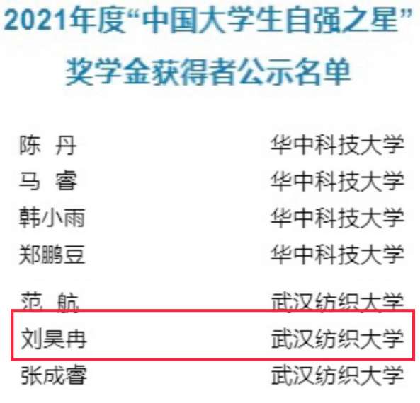 近日,由共青团中央、全国学联指导,中国青年报社、新东方教育科技集团、中国青年创业就业基金会联合举办的2021年度“中国大学生自强之星”奖学金推报活动评选结果已揭晓。经各高校推荐、省级初评、全国评审等环节,材料学院2019级本科生刘昊冉(社区实践类)荣获2021年度“中国大学生自强之星”奖学金。