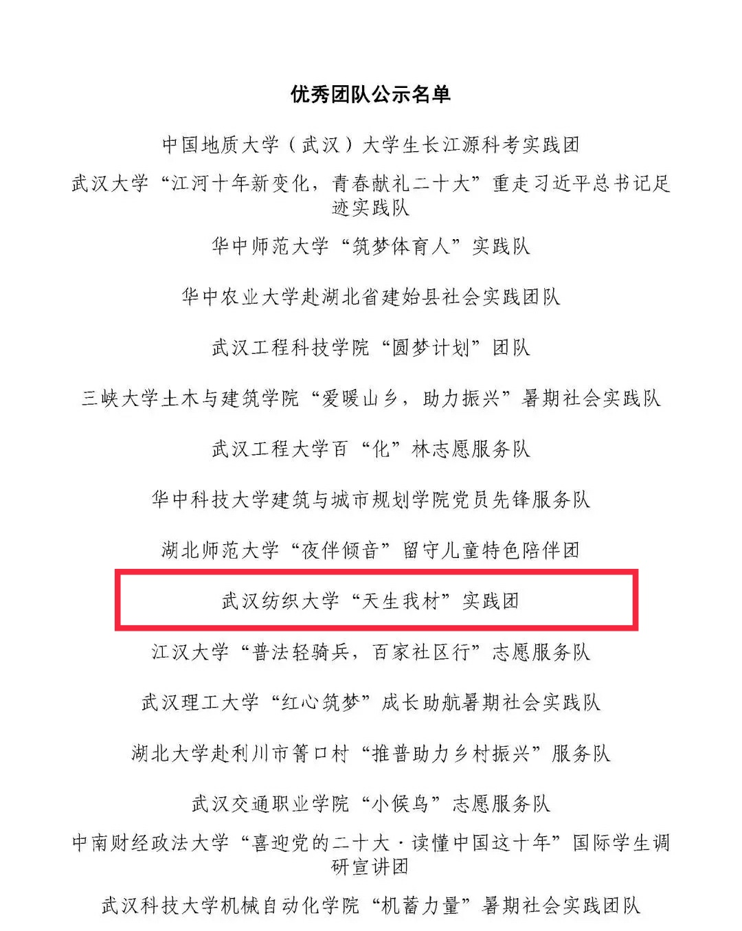 近日,团中央公布了2022年全国大中专学生志愿者暑期文化科技卫生“三下乡”社会实践活动总结通报结果。经过基层申报、省级团委审核推荐、组织评议等环节,我校材料学院“天生我材”实践团荣获“优秀团队”称号。