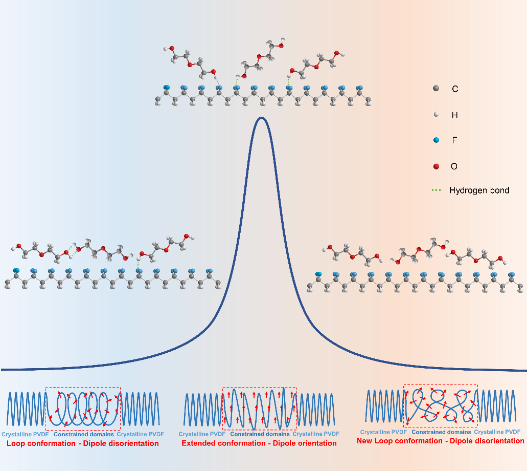 在此前发表的姊妹篇论文中,团队首次观察到αc弛豫诱导室温热响应强介电脉冲现象,在近日发表的论文中,团队报道了产生弛豫的相互作用的具体形式和过程,证明了氢键对极性结晶性聚合物热响应介电行为的贡献,即通过两步氢键重组和由此产生的αc弛豫实现了显著介电脉冲效应。