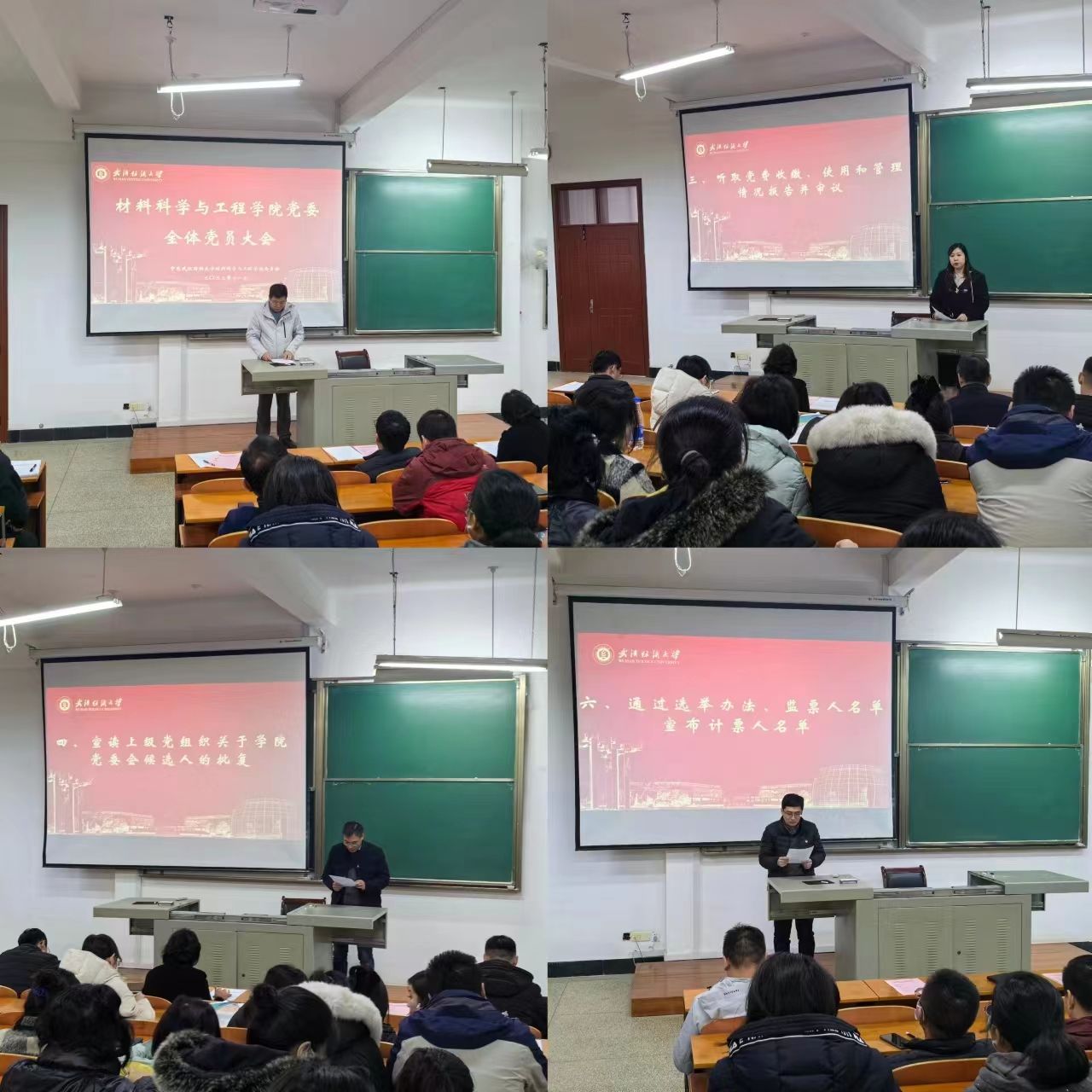 大会听取并审议了党费收缴、使用和管理情况报告,宣布了9名党委委员候选人预备人选的及情况介绍,通过了《材料学院党委党员大会选举办法(草案)》、监票人、计票人名单。