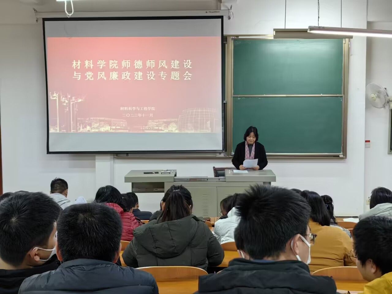 11月30日下午3点,材料学院在8F201召开师德师风建设与党员廉政建设专题会,全体教职工参加会议,会议由学院党委书记陈桂枝主持。