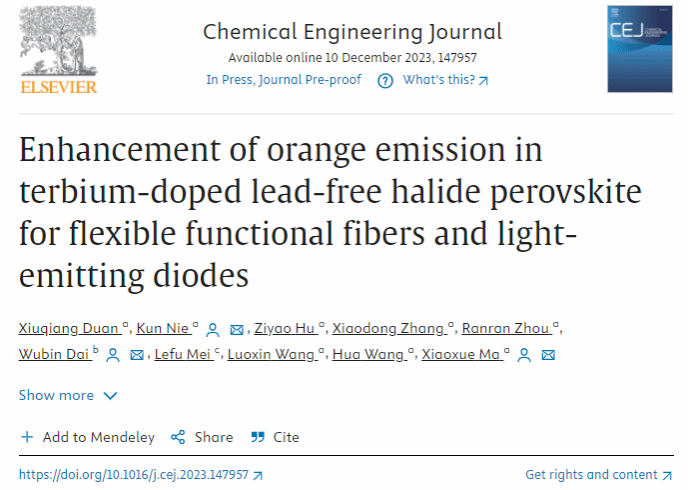 12月10日,工程技术领域国际知名期刊《Chemical Engineering Journal》(中科院1区Top期刊,影响因子15.1)在线发表我校王桦教授团队聂坤博士和马晓雪博士在无铅金属卤化物钙钛矿功能纤维复合材料方面取得的重要进展—“Enhancement of orange emission in terbium-doped lead-free halide perovskite for flexible functional fibers and light-emitting diodes” (DOI: https://doi.org/10.1016/j.cej.2023.147957)。 ok138cn太阳集团省部共建纺织新材料与先进加工技术国家重点实验室及湖北省纺织新材料及应用重点实验室为第一完成单位。ok138cn太阳集团聂坤博士(第一通讯)和马晓雪博士(最后通讯)为论文的责任通讯作者,论文第一作者为材料学院2021级硕士研究生段修强。
