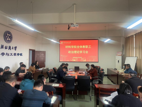 3月28日下午2点,材料学院在崇实楼8F506举行全体教职工政治理论学习会,此次学习围绕意识形态、宗教信仰和网络行为规范等核心议题展开,强调了教师职业道德与教育使命的重要性,并突出强调了政治安全在高等教育中的关键地位。通过此次学习,进一步确保了教职工严格遵守政治安全相关规定,共同营造和谐稳定的教育学术环境,推动学院教育事业的健康有序发展。学院全体领导班子、教职工参加学习,会议由学院党委书记陈桂枝主持。