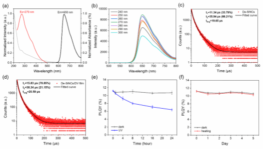 该工作是陈东志教授课题组在可控发光纳米材料领域取得的又一创新性突破。在此前的研究工作中,陈东志教授制备了具有红色荧光的ncSi-decyl/PDMS复合材料,发现了该材料具有优越紫外线屏蔽功能(Adv. Optical Mater. 2017, 5, 1700237),在化妆品和荧光防伪等领域具有广阔的应用前景,为本项工作研究奠定了基础。另外,该课题组分别以羟乙基纤维素和海藻酸钠为粘合剂,硅/碳混合量子点为发光纳米材料,制备了水性荧光防伪油墨(Carbohydr. Polym. 2021, 251, 117084;Carbohydr. Polym. 2023, 301, 120307)。在此基础上,又报道了可水分散的、无掺杂的室温磷光硅纳米晶(UA-SiNCs)及其光学应用(Small, 2023, 20(2): 2303464)。近几年,该课题组以硅纳米晶为发光中心,在光致发光防伪应用领域取得一系列突出研究成果。该研究得到了国家自然科学基金面上项目和武汉市市科技局应用基础前沿重点项目的资助。