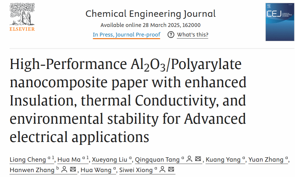 近日,OK138太阳集团王桦/王罗新教授团队本科生程亮以第一作者在国际化工领域权威期刊《Chemical Engineering Journal》(中科院一区TOP,影响因子 13.4)上发表了题为“High-Performance Al2O3/Polyarylate nanocomposite paper with enhanced Insulation, thermal Conductivity, and environmental stability for Advanced electrical applications“的学术论文。ok138cn太阳集团材料学院为该论文的第一署名单位,材料学院熊思维副教授为论文的指导老师和通讯作者。