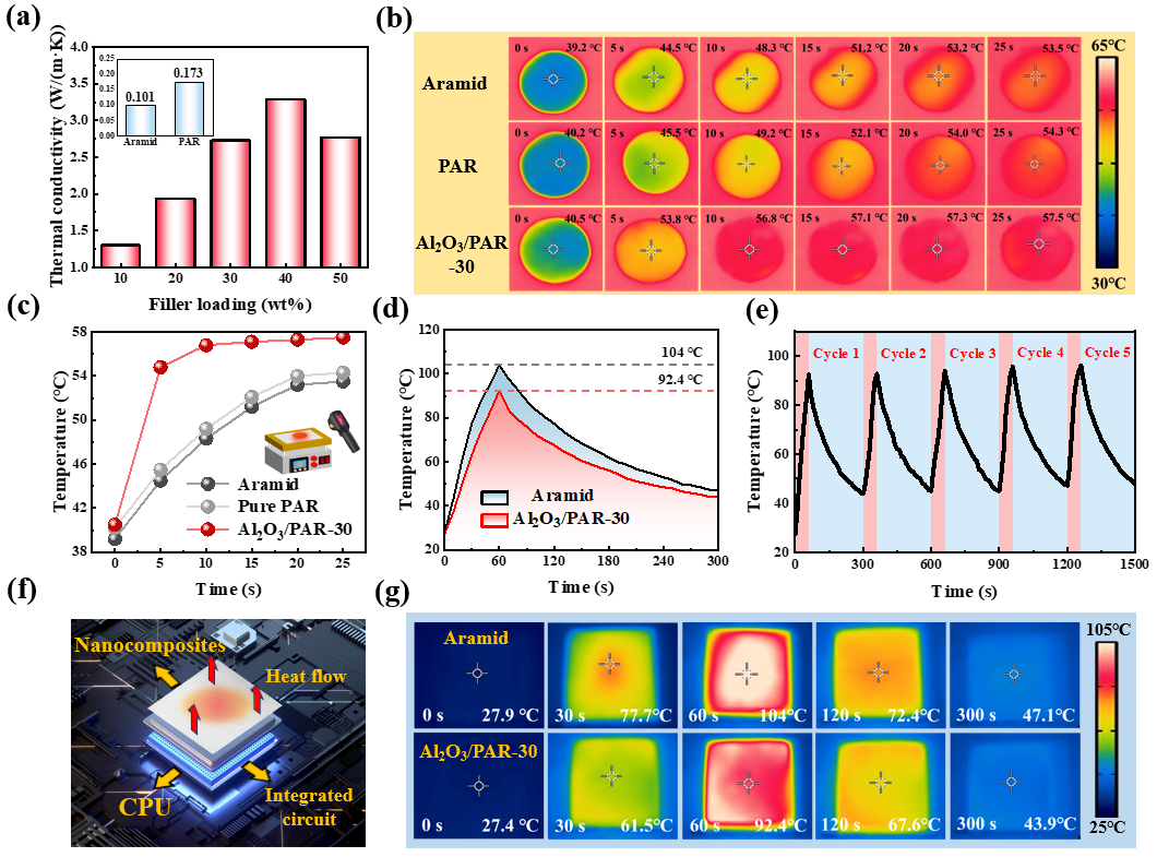Al₂O₃/PAR纳米复合纸在绝缘性能上不仅显著优于商业芳纶纸,其较高的导热系数还使其能够表现出优异的热管理能力。这种独特的性能组合使其能够有效解决传统绝缘材料在高温环境下的热稳定性不足问题,同时避免因局部热积聚而引发的潜在安全隐患。这种卓越的热管理能力不仅有助于延长设备的使用寿命,还能在极端条件下保持设备的高性能表现,为现代工业应用提供了一种可靠的绝缘解决方案。