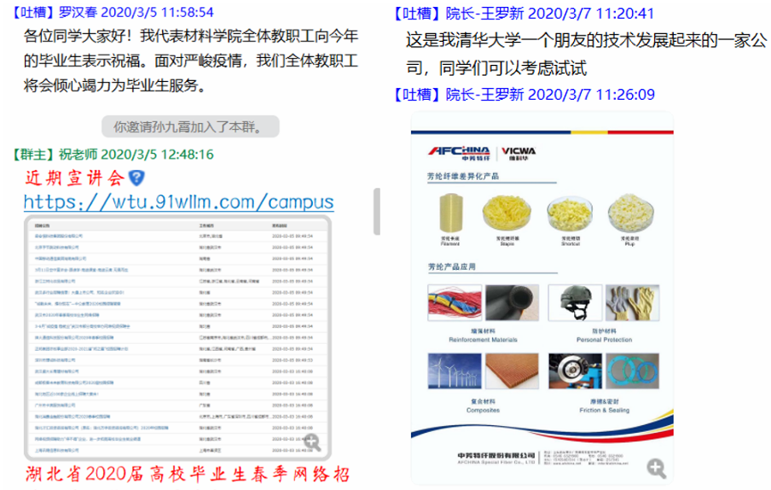 学院领导班子和专业老师纷纷出击,进一步挖掘和整合丰富的校友资源和行业资源,向社会发出动员倡议,夯实紧密的校企联动工作机制。通过搭建“云双选”平台,为毕业生提供相关就业岗位,串联起疫情期间学生的就业保障链条,实现既服务行业校友企业需求又促进毕业生就业的良性互动。目前,中国化学纤维工业协会启动了促进校企用工招聘工作,为学生提供安全便捷的求职招聘服务,新增数十家专业对口的校友企业开展在线招聘,稳健医疗、联洋新材料等知名校友企业已和数名毕业生完成签约,更多地优质岗位将陆续推送给毕业生。