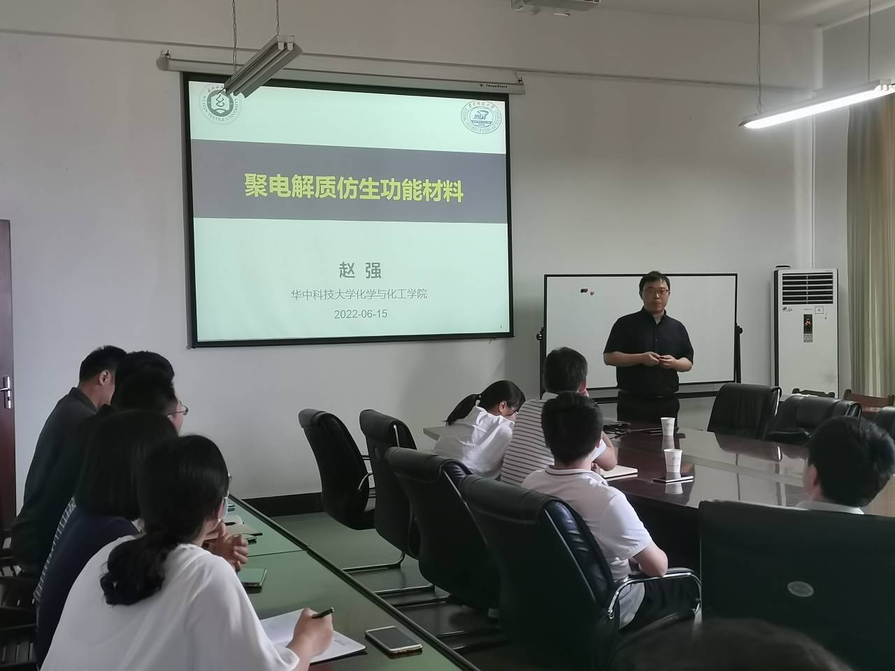 为加强院内师生间的学术交流,提高研究生素质和科研氛围。OK138太阳集团于6月15日下午,邀请华中科技大学化学与化工学院副院长,国家级青年人才赵强教授以“聚电解质仿生功能材料”为题进行了专题报告。材料学院全部领导、部分老师和研究生参加了此次活动,讲座由学院副院长顾绍金主持。