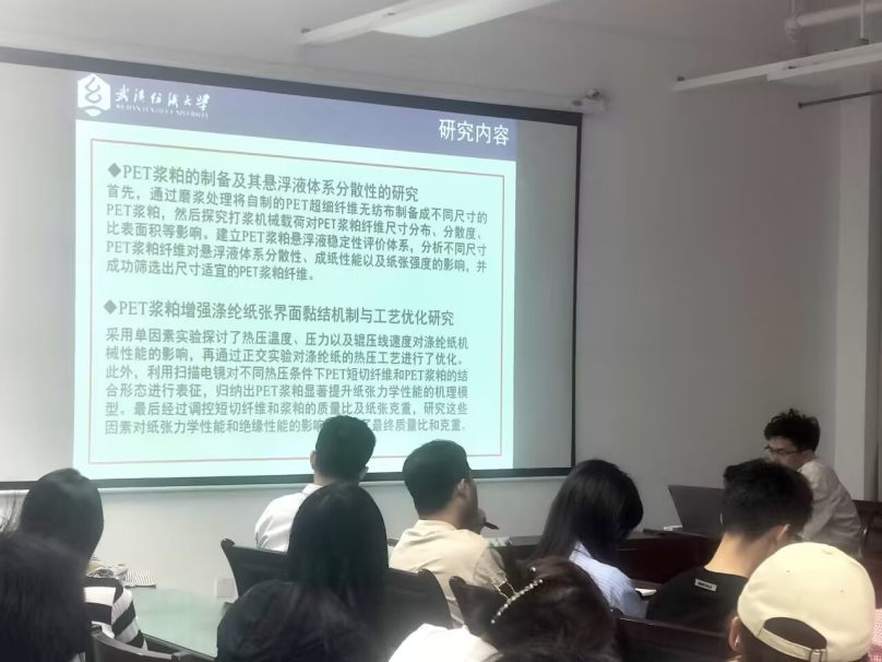 殷龙同学带来《基于涤纶超纤浆粕的涤纶纸基材料制备与性能研究》,他深入研究了不同尺寸 PET 浆粕对悬浮液分散稳定性及成纸性能的影响,通过磨浆处理自制 PET 超细纤维无纺布得到不同尺寸的 PET 浆粕,并建立悬浮液稳定性评价体系筛选出适宜尺寸的浆粕纤维。同时,采用单因素和正交实验优化涤纶纸热压工艺,确定了热压温度、压力、线速度以及 PET 短纤和 PET 浆粕质量比、纸张克重的最佳参数。