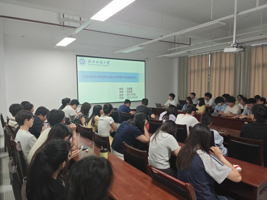汪振豪同学以《石墨烯复合电极材料及其水系锌离子电池的研究》为题进行汇报。成功研制出石墨烯纳米带/钒酸铵复合材料(NVGR),破解了水系锌离子电池正极材料容量低、循环稳定性差的核心难题。该材料创造性地利用石墨烯纳米带构建三维导电网络,使电池在452.3 mAh/g的高比容量下,仍保持76%的循环稳定性,能量密度达316 Wh/kg。石墨烯的加入显著降低电阻并抑制电极结构塌陷,为大规模储能提供了新路径。