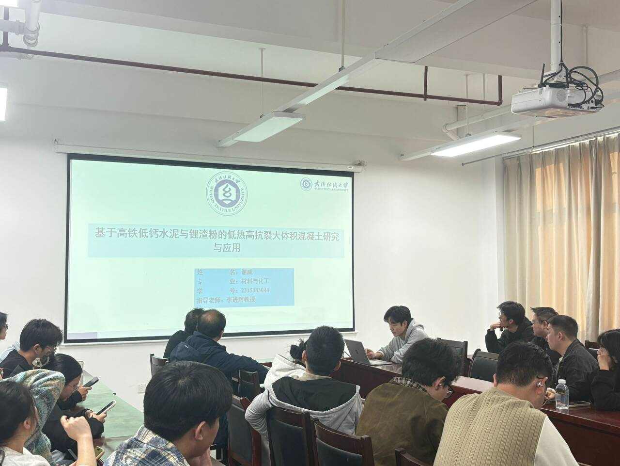 谢威同学汇报了《基于高铁低钙水泥与锂渣粉的低热高抗裂大体积混凝土研究与应用》。针对大体积混凝土温控防裂难题,他系统研究了高铁低钙水泥与锂渣粉协同作用机制,提出锂渣掺量20 %、比表面积742 m² kg⁻¹、粉煤灰30 %、温缩纤维1.5 %的最优配比。该配方3 d水化热仅134.7 J g⁻¹,28 d抗压强度达36.8 MPa,抗裂等级提升40 %以上,对“双碳”战略下的绿色交通建设应用提供了新思路。