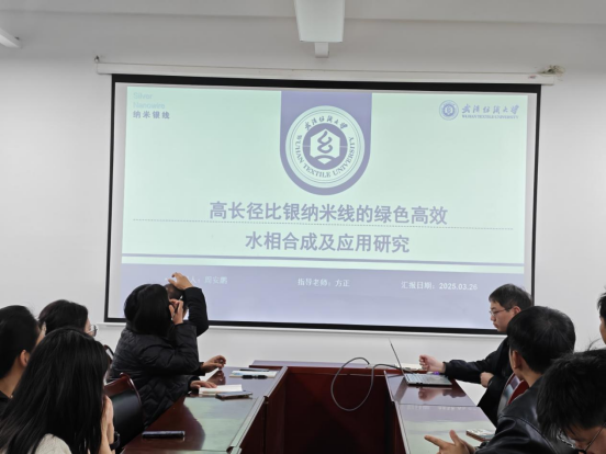 周安鹏同学汇报了《高长径比银纳米线的绿色高效水相合成及应用研究》。他针对传统银纳米线制备工艺复杂、条件苛刻、成本高昂的问题,开发了一种基于植物多酚和种子介导法的绿色高效水相合成方法。该方法利用咖啡酸作为还原剂,通过添加银种子精准控制银纳米线的形貌和尺寸,在温和条件下成功制备出高纯度、高长径比的银纳米线。这项研究为柔性透明导电薄膜的低成本、环保化生产提供了新思路。