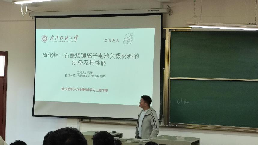 最后一个同学张珊介绍了硫化钼-石墨烯锂离子电池负极材料的相关内容,讲解了MoS2的理论储锂容量可达1000mAh/g,具有典型的2D层状结构,有利于Li+的往返扩散,适合大电流充放电等优异特性的同时也具备电导率低,因此具有较差的循环周期、不佳的倍率性能和严重的容量衰减等缺点。