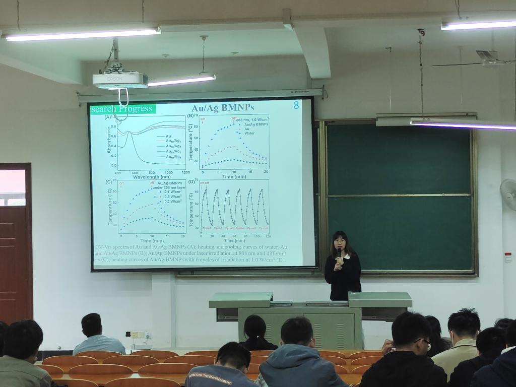 随后,吕雪莲同学介绍了植物多酚还原法制备金属复合材料的相关内容。其以植物多酚来源广泛并且可以作为良好的还原剂、成膜剂、稳定剂为出发点,采用液相还原法制备了可催化对硝基苯酚降解的多分支金/银双金属纳米粒子;并通过对制备结果进行的全面讨论得出了制备金属复合材料采用植物多酚还原法的许多优点。