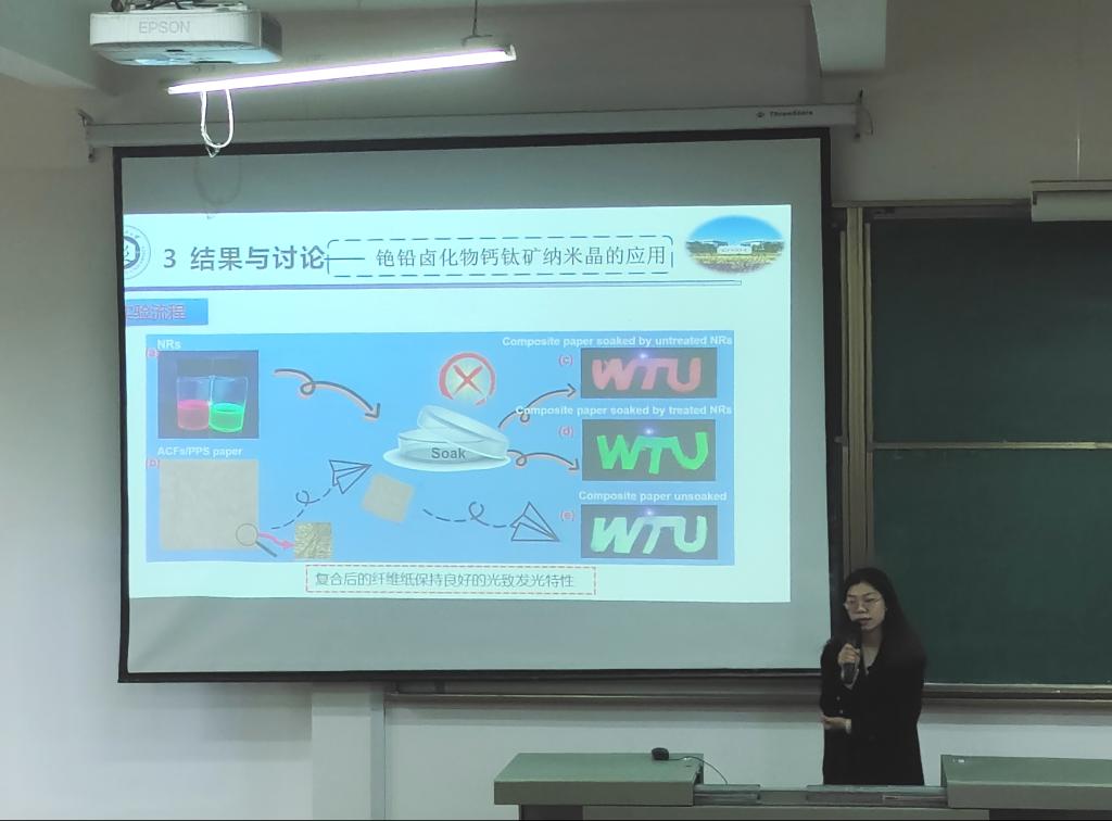 首先,周冉冉同学对铯铅卤化物钙钛矿纳米晶的改性及其应用进行了介绍。 主要讲解了为提高铯铅卤化物钙钛矿纳米晶的稳定性和发光性能、完善钙钛矿体系,实验采用了卤素离子交换方法对热注射合成的纳米晶进行改性;并提到利用铯铅卤化物纳米晶的光致发光特性与聚苯硫醚芳纶纸进行后渗透复合,可以给予纤维荧光性能,由此在紫外光照射下的显色反应可以实现荧光防伪领域的应用。