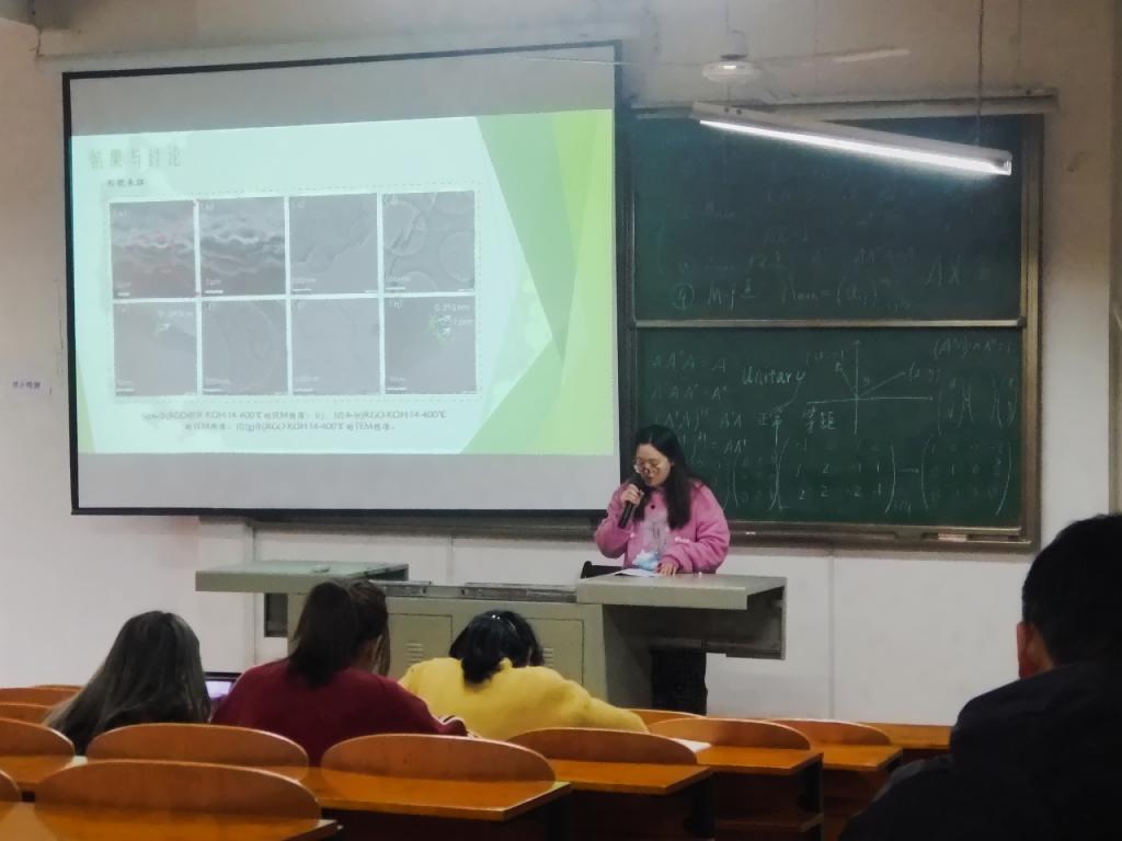随后,李林子同学向大家介绍到目前人们对便携式和可穿戴电子产品日益增长的兴趣,其中全固态柔性超级电容器因其灵活性、快速充放电速率、长循环寿命、高功率密度、可持续性和低成本等诸多优点而受到学术界和工业界的极大关注,因此本课题希望通过简单地真空抽滤的方法制备出一种KOH活化后的还原氧化石墨烯/蚕丝短纤维复合薄膜,薄膜用于超级电容器的柔性电极材料。之后又向大家介绍了自己的实验方法以及对结果进行了讨论。