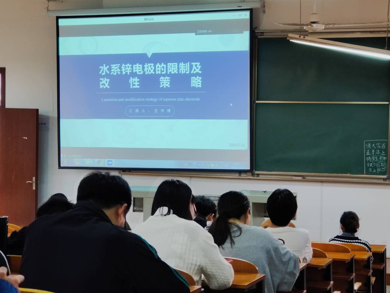 王宇捷以水系锌电极的限制基改性策略为题,从研究背景、锌负极面临的问题、解决途径、展望四个方面展开了报告,指出水是理想的电解质溶剂,是从根本上避免引起火灾和爆炸的易燃有机电解质,可以免除严格的制造要求,水和水溶性电解质盐的成本相对较低,水系电解质的离子电导率高,并且水溶剂完全无毒且对环境无害,种种原因迎来了水系电池的兴起,激发了在场老师及同学们的热烈讨论。