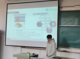 首先,江威介绍了他的研究成果,题为“纤维基电致变色器件的制备及红外屏蔽性能研究”,研究主要制备了一种基于纤维的电致变色器件,具有轻薄、柔软的特点,可轻松集成到各种纺织品中。接下来,李志颖介绍了他的研究题目:“聚乳酸超细纤维层合结构的聚乳酸/纤维素浆粕复合纸用于环保吸管”,他表示他的研究材料采用了聚乳酸超细纤维层合结构,以聚乳酸和纤维素浆粕为主要原料,制备而成的复合纸材料不仅具有良好的柔软性和韧性,而且在环保性能方面表现出色。然后,段修强的汇报题目是“基于铯锰卤化物钙钛矿材料的制备、性能研究及其应用”,他汇报的实验结果表明,他所制备的铯锰卤化物钙钛矿材料具有优异的光电性能,包括高光吸收率、较高的载流子迁移率以及稳定的光电转换效率。最后,朱志博介绍了他的研究题目:“热缩型纤维预应力对水泥基复合材料增强机理的研究”,在揭示增强机理方面,他发现,热缩型纤维预应力能够有效地改善水泥基复合材料的微观结构,增加纤维与水泥基体之间的黏结力,从而提高材料的整体强度和耐久性。