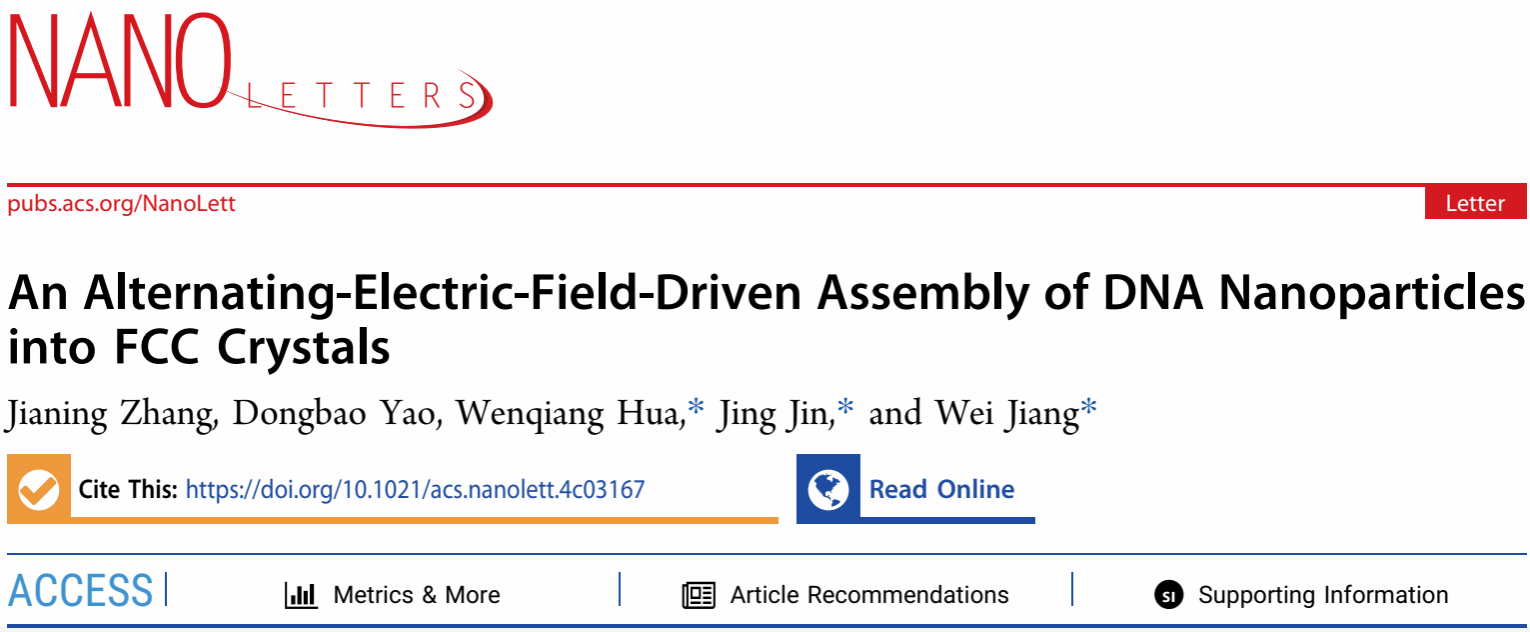 近日,OK138太阳集团姜伟教授团队在《Nano Letters》期刊上发表了题为“An Alternating-Electric-Field-Driven Assembly of DNA Nanoparticles into FCC Crystals”的论文。ok138cn太阳集团省部共建纺织新材料与先进加工技术国家重点实验室和材料学院为该论文的第一署名单位和通讯单位,材料学院张佳宁博士为论文第一作者,材料学院金晶教授和姜伟教授为论文的共同通讯作者。
