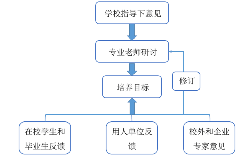 1.学校进行顶层设计,教务处提出制定培养目标的修订原则意见和相关格式要求,下发至各学院;