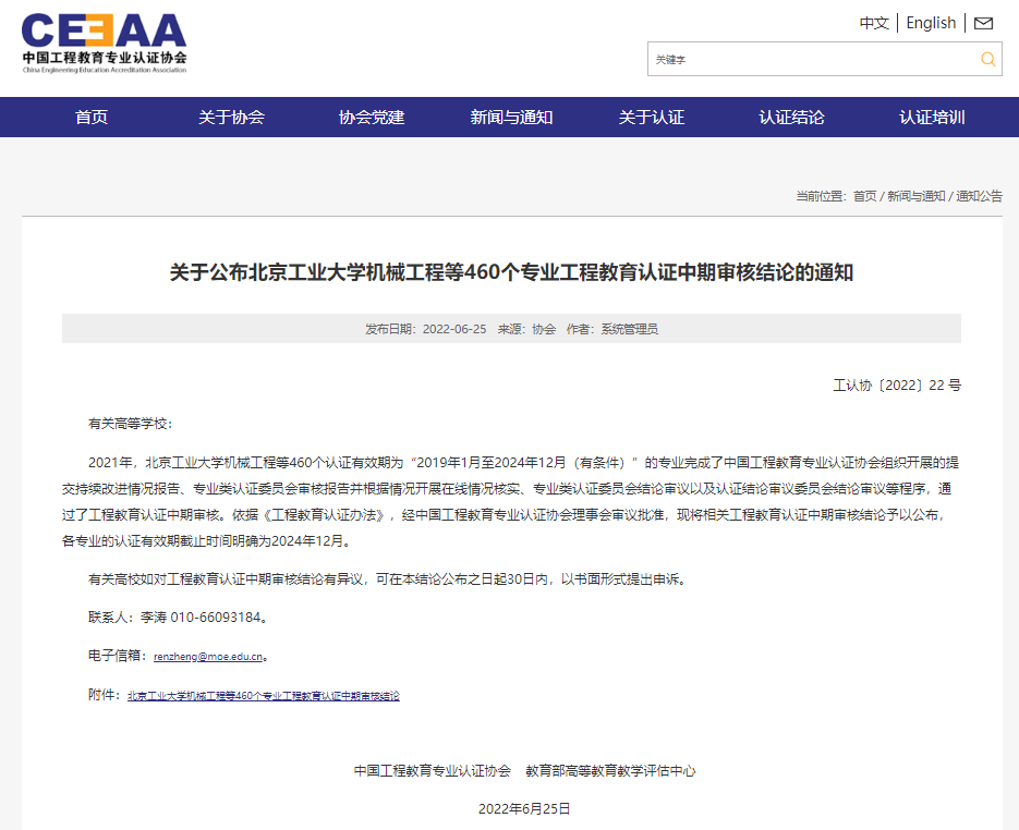 近日,中国工程教育专业认证协会、教育部高等教育教学评估中心发文《关于公布北京工业大学机械工程等460个专业工程教育认证中期审核结论的通知》(工认协〔2022〕22号),公布了2021年460个认证有效期为“2019年1月至2024年12月(有条件)”的专业通过全国工程教育专业认证中期审核结论。其中,我校OK138太阳集团高分子材料与工程专业顺利通过工程教育认证中期考核,继续保持有效期至2024年12月。