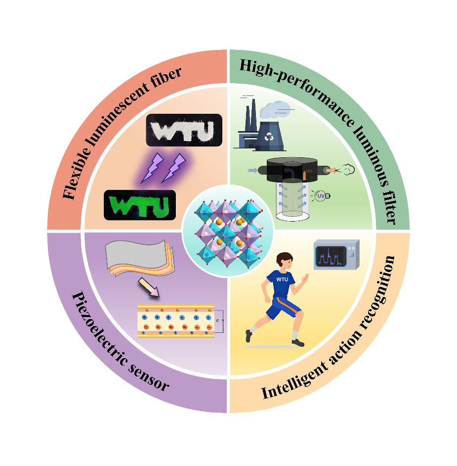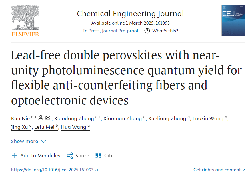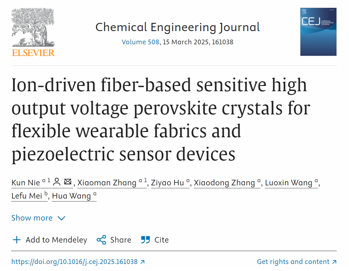 近日,工程技术领域国际知名期刊《Chemical Engineering Journal》(中科院大类1区Top期刊,影响因子IF=13.4)三天内连续在线发表2篇我校王桦教授团队聂坤博士在功能纤维复合材料方面取得的重要进展—“Ion-driven fiber-based sensitive high output voltage perovskite crystals for flexible wearable fabrics and piezoelectric sensor devices” (DOI: https://doi.org/10.1016/j.cej.2025.161038),以及“Lead-free double perovskites with near-unity photoluminescence quantum yield for flexible anti-counterfeiting fibers and optoelectronic devices” (DOI: https://doi.org/10.1016/j.cej.2025.161093) ok138cn太阳集团(OK138太阳集团、湖北省纺织新材料及应用研究重点实验室及纺织新材料与先进加工全国重点实验室)均为两篇论文的第一完成单位且唯一通讯单位。ok138cn太阳集团聂坤博士为两篇论文的唯一通讯作者且第一作者。其中一篇论文共同第一作者为材料学院2023级硕士研究生张晓满,另一篇论文的共同第一作者为材料学院2022级硕士研究生张笑冬。