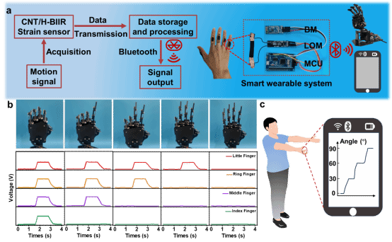 所制备的导电弹性体基应变传感器表现出卓越的传感性能,包括低电滞后(2.3%)、超低检测限(0.1%)、宽线性工作范围(690%)和优异的耐久性(>10,000次循环)。该应变传感器适用于各种人体生理和运动监测。将其集成到智能可穿戴系统中,可实现人机交互和人体手指弯曲角度的测量。此外,离子交联网络的引入赋予传感器优异的抗菌性能。总体而言,该研究为高性能传感器的设计与制备提供了有利方法,开发的传感器在可穿戴电子设备领域具有广阔的应用潜力。