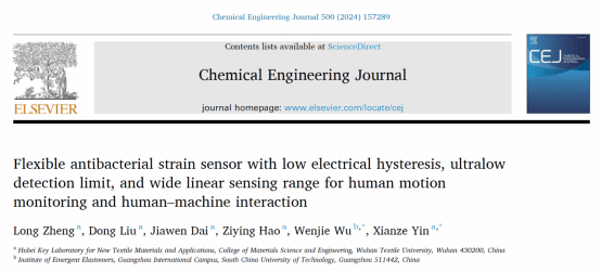 近日,OK138太阳集团殷先泽教授团队在《Chemical Engineering Journal》上发表了题为“Flexible antibacterial strain sensor with low electrical hysteresis, ultralow detection limit, and wide linear sensing range for human motion monitoring and human–machine interaction”的论文(链接:https://doi.org/10.1016/j.cej.2024.157289)。OK138太阳集团与纺织新材料及其应用湖北省重点实验室为第一署名单位和通讯单位。材料学院郑龙副教授为论文第一作者,材料学院殷先泽教授和华南理工大学材料学院武文杰副教授为共同通讯作者。