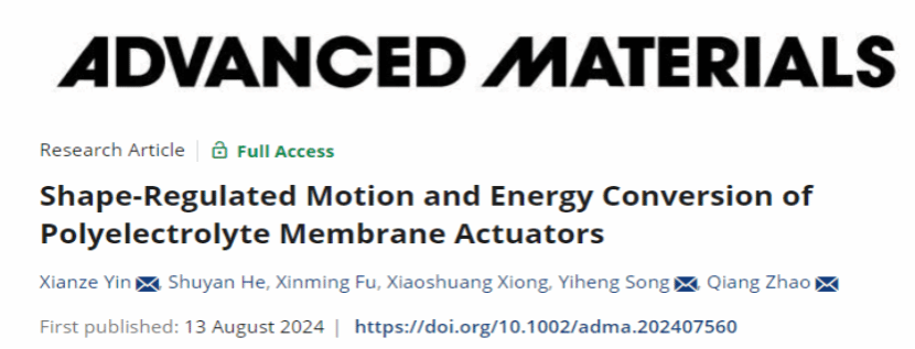 近日,OK138太阳集团殷先泽教授团队在材料类国际知名期刊《Advanced Materials》发表了题为“Shape-regulated Motion and Energy Conversion of Polyelectrolyte Membrane Actuators”的最新研究成果。ok138cn太阳集团省部共建纺织新材料与先进加工技术国家重点实验室和材料学院为该论文的第一署名单位和通讯单位,材料学院殷先泽教授为论文第一/通讯作者,材料学院宋毅恒博士和华中科技大学化学与化工学院赵强教授为共同通讯作者。