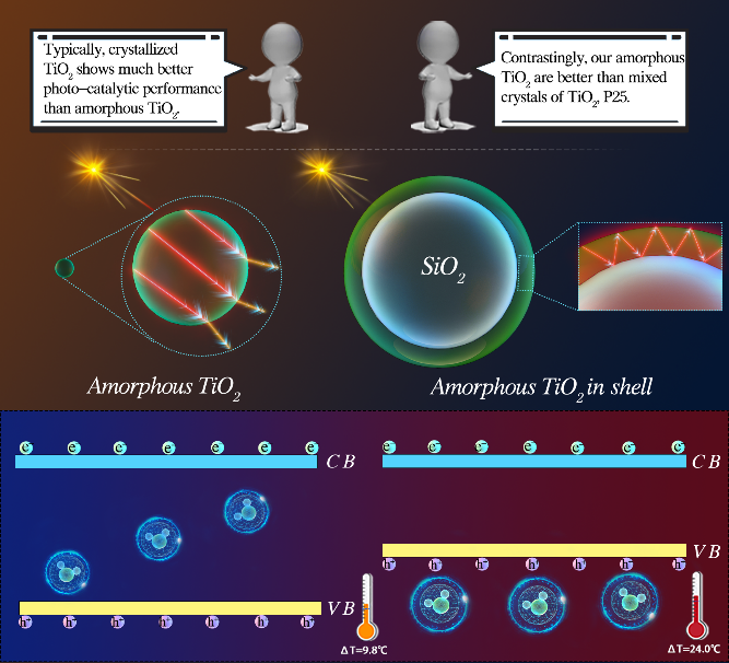 TiO2的结构主要包含结晶型和无定型两种。其中,结晶型TiO2(金红石和锐钛矿)在光激发下呈现出较高的催化活性,但工业制备复杂,排放废弃物多,晶型转变需长时高温(>500 oC)煅烧,能耗高。相比结晶型TiO2,无定形TiO2由于结构缺陷导致催化活性差,但制备能耗低且工艺简单。根据经典物理学理论,大多数半导体的禁带宽度与温度呈现负相关性,即禁带宽度随温度升高而下降。因此,作者首次充分利用太阳能转化为热能,通过简单改性使无定形TiO2形成类似“鸡蛋”保温结构的SiO2@TiO2核壳催化剂,利用光热转换效率实现对禁带宽度的调控,从而在室温可见光下具有高催化活性。