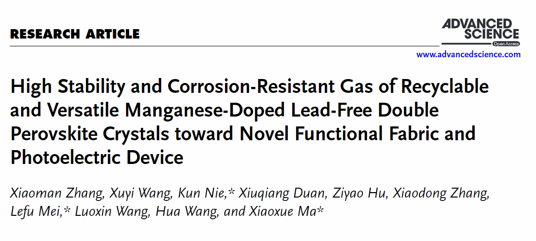 近日,综合性国际著名期刊《Advanced Science》(中科院大类1区Top期刊,影响因子IF=15.1)在线发表我校材料学院王桦教授团队聂坤博士和马晓雪博士等在无铅双钙钛矿与功能纤维复合材料方面取得的重要进展—“High Stability and Corrosion-Resistant Gas of Recyclable and Versatile Manganese-Doped Lead-Free Double Perovskite Crystals toward Novel Functional Fabric and Photoelectric Device” (DOI: https://doi.org/10.1002/advs.202403352)。ok138cn太阳集团为论文的第一署名单位。ok138cn太阳集团聂坤博士为第一通讯作者,马晓雪博士为共同通讯作者,论文第一作者为材料学院2023级硕士研究生张晓满。