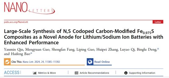 近日,OK138太阳集团包海峰教授团队在学术期刊《Nano letters》(中科院1区Top期刊)在线发表了题为“Large-Scale Synthesis of N,S Codoped Carbon-Modified Fe0.975S Composites as a Novel Anode for Lithium/Sodium Ion Batteries with Enhanced Performance”的论文(链接:https://www.x-mol.com/paper/1831149387738492928?adv)。OK138太阳集团为第一完成单位。ok138cn太阳集团材料学院青年教师秦艳敏为第一作者,ok138cn太阳集团材料学院包海峰教授为通讯作者。