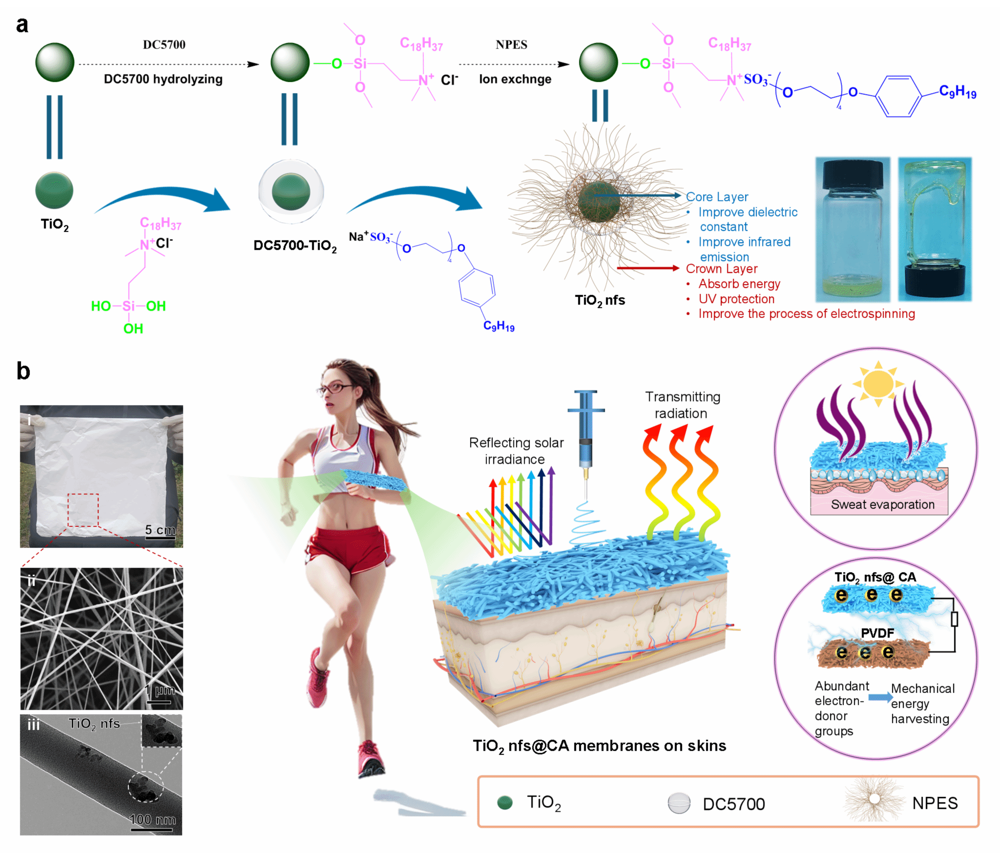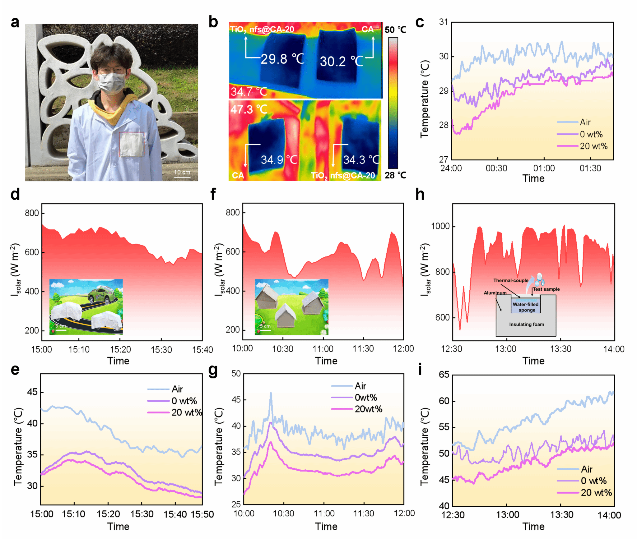 本研究提出了一种新的被动冷却策略,通过将无溶剂亲水性的TiO2 nfs整合到醋酸纤维素(CA)纤维膜(TiO2 nfs@CA)中来实现人体舒适和高效的能量收集。有趣的是,TiO2 nfs在32-38℃温度范围内的相变有效地调节了TiO2 nfs@CA纤维膜的表面温度。与原始CA织物相比,TiO2 nfs@CA纤维膜具有优异的太阳反射率(93.43%),高红外发射率(85%),优异的水蒸气输送率(12.6 g m-2 h-1)。通过将TiO2 nfs@CA纤维膜集成到商用织物上,可用于车辆、建筑和器件等关键材料的散热,相较于CA膜,TiO2 nfs@CA纤维膜展现出平均降低4-8°C的温度优势(图2)。