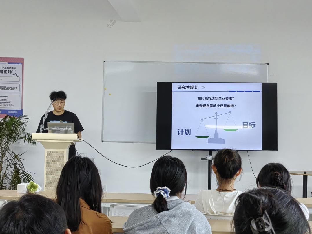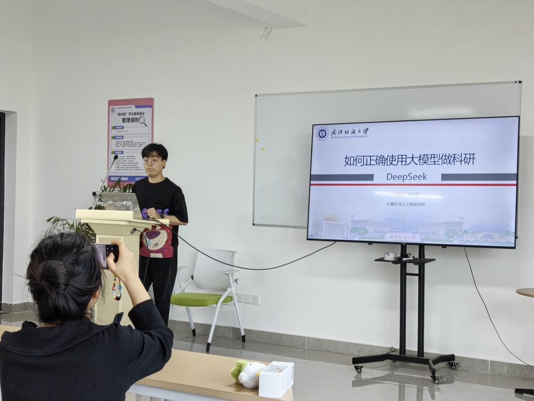 在互动交流环节,同学们积极踊跃,就构建科研能力图谱过程中遇到的困难,如如何平衡课程学习与科研实践,以及使用大模型时遇到的技术难题等问题进行提问交流。彭智勇同学和苗佳哲同学分别结合自身经验,为同学们一一耐心解答,现场交流氛围浓厚。