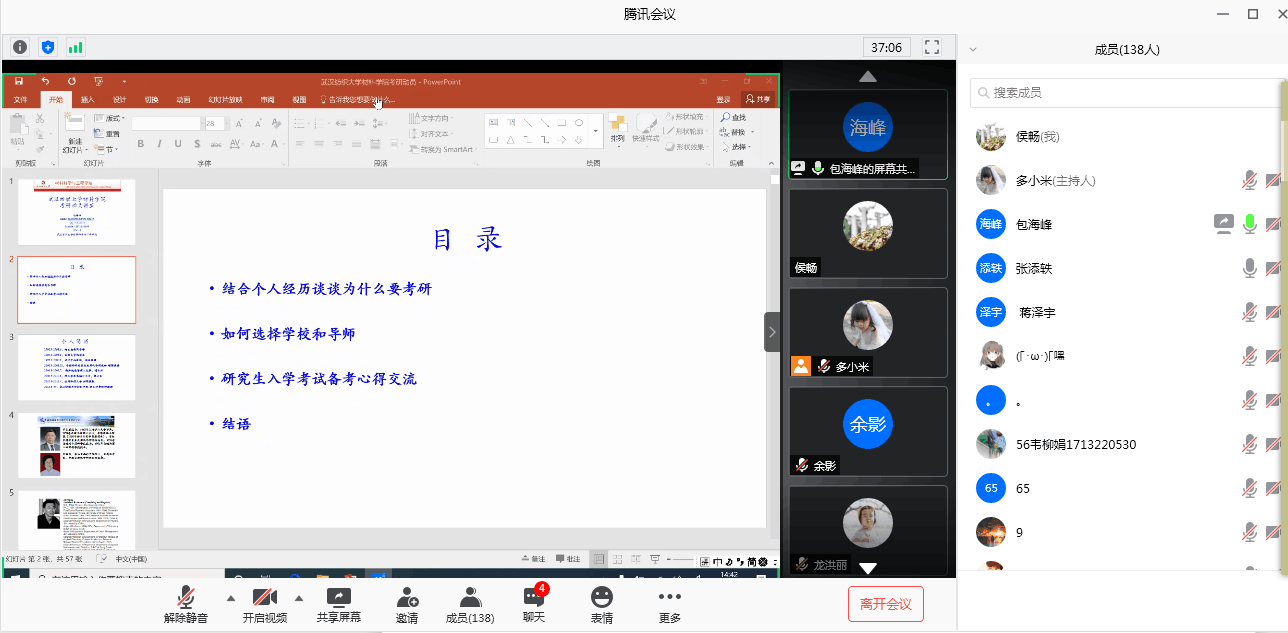 为了更好地为考研学子提供帮助,使同学们对考研有更加深入的了解,帮助大家确立正确的奋斗目标,增强考研信心,提升考研竞争力,材料学院特邀副院长包海峰教授在腾讯会议平台开展线上考研指导讲座,全体2017级学生,部分2018、2019级学生参加了讲座。