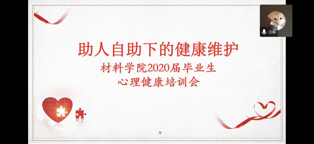 为进一步缓解学院毕业生的求职焦虑,4月24日,材料学院毕业生辅导员祝捷老师组织全体2020届毕业生进行了心理健康教育云班会。班会主题为《助人自助下的健康维护》。全体毕业生心理委员和班级同学参加了此次班会。