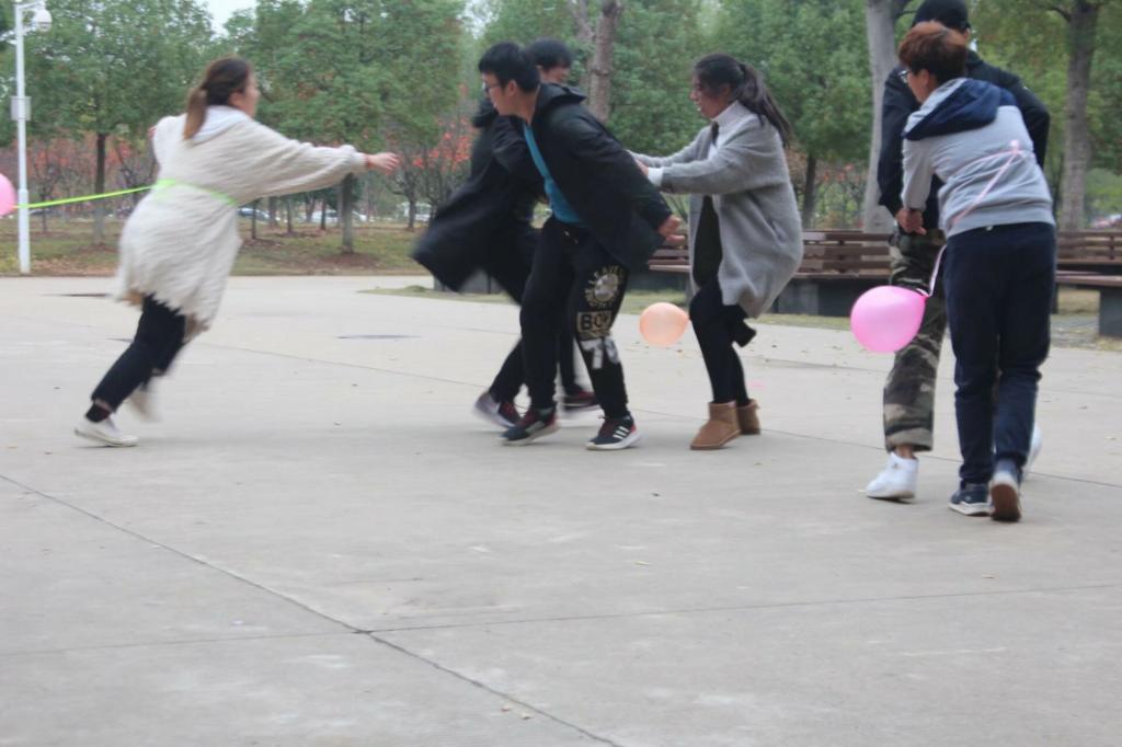 8个小组随后进行了你比我猜的游戏,一个同学比划动作让另一个同学猜出对应的词语,同学们也是玩得不亦乐乎。同学们在之后的歌曲接力活动更是积极活跃,每组派会唱歌的两人,主持人说出一个字,参赛选手抢唱出一句带这个字的歌。在这个游戏里,大家一起合作想歌词,在不知不觉中熟悉了起来。最后的踩气球活动更是激动人心,每组一男一女参赛,女生身后绑气球,男生要保护女生的气球不被踩破,同时去踩另一组的气球。这个活动看的是让人酣畅淋漓,同学们也是得到了极大的放松。