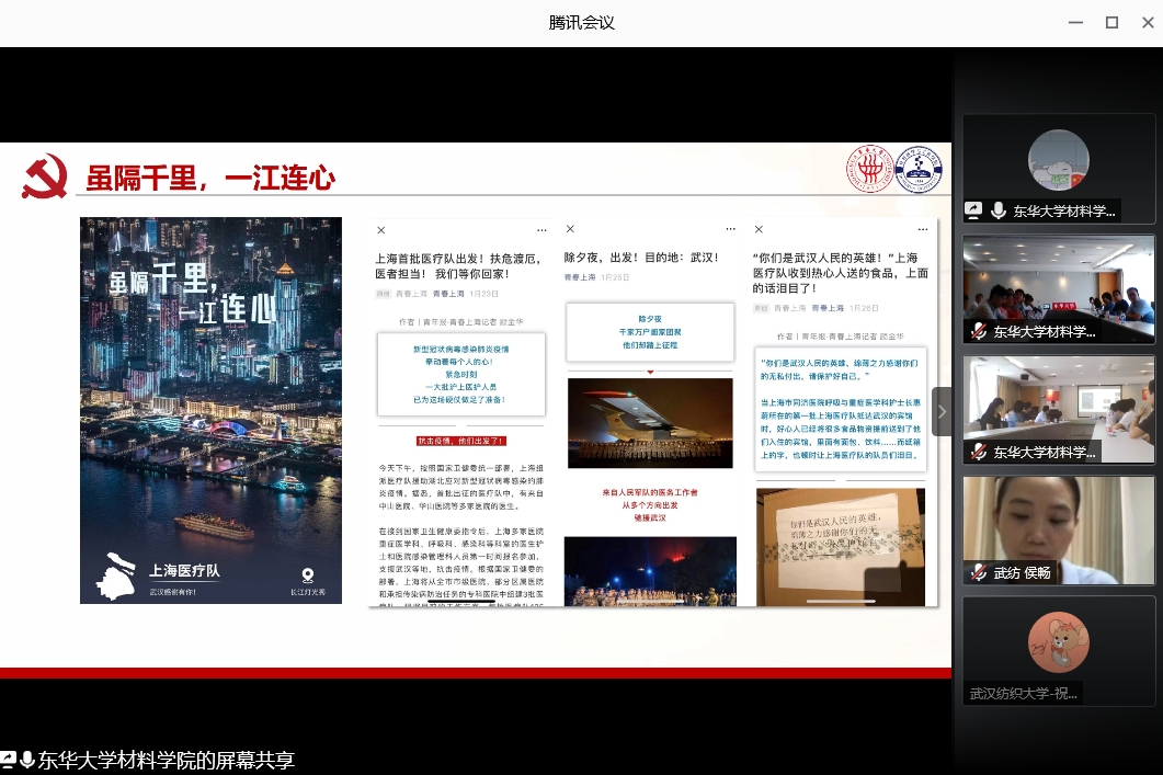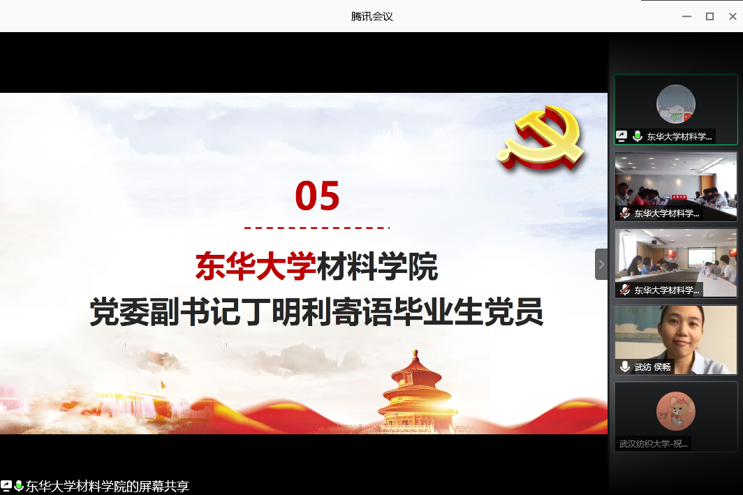 2020 年 6 月 19 日 10:30,材料学院与东华大学材料学院在腾讯会议联合开展了“一五一实讲党史,牢记使命展担当”主题党日暨 2020 届毕业生党员离校教育,两院全体毕业生党员参加了此次会议。会议由东华大学OK138太阳集团学生党建辅导员吴佳主持。