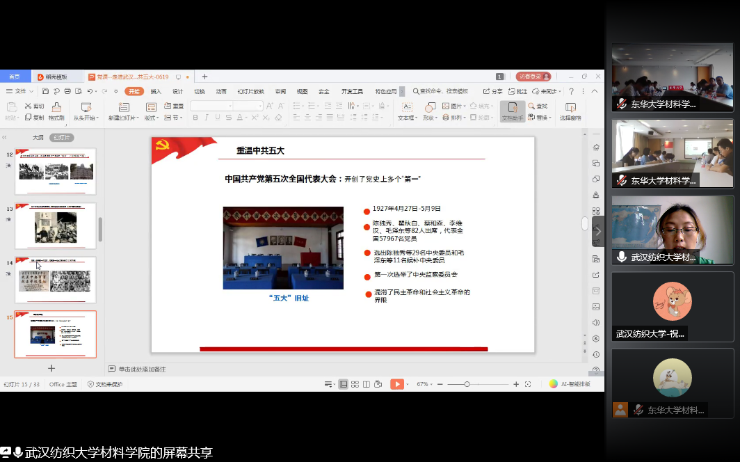 活动在庄严的国歌声中拉开序幕,东华大学材料学院毕业班党支部书记刘锦博、材料学院学生支部书记黄鹤分别给毕业生党员同志讲授了关于上海、武汉两座城市的红色历史,重温了中共一大、二大、五大等中共中央重要会议的历史及其对党作出的重要贡献和作用,并寄语毕业生党员要多读历史,从历史中汲取更多精神营养。一是要坚守马克思主义信仰,坚定共产主义远大理想,坚持中国特色社会主义共同理想;二是要牢记历史,牢记时代赋予我们的使命,解放思想、勇于创造,让中华民族伟大复兴的中国梦在一代代青年的接力奋斗中变为美好的现实;三是要向老一辈革命家学习的同时, 更要勇于担负起肩上的责任,努力答好新时代的问卷,谱写属于自己的青春华章。