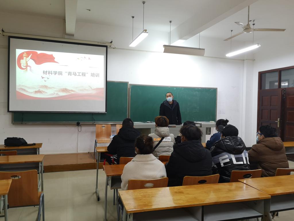 2020年11月27日晚,材料学院2020年“青马工程”培训会在6栋教学楼106开展。材料学院学生党支部书记毛成兴围绕“不忘初心、牢记使命”和 “中国共产党人的精神”主题,向青马学员传递红色精神和理论知识。